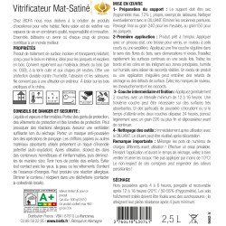Rendu incolore, bonne résistance mécanique, anti salissures, hydrofuge et antistatique. Dilution avec diluant. Intérieur. COV 460 g/l max, classe A+